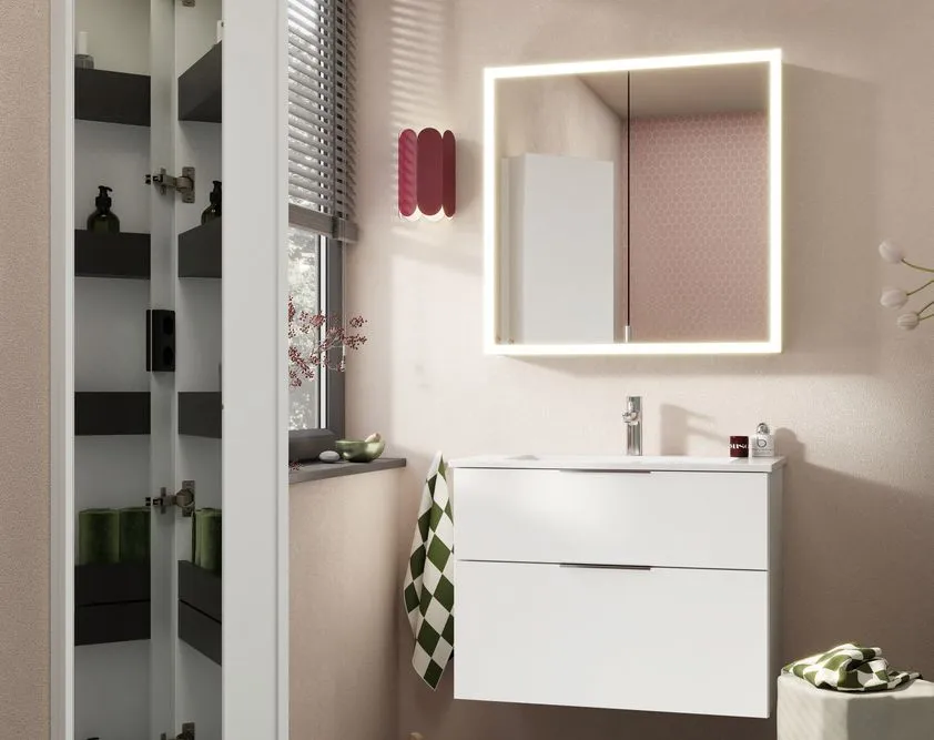 Neu ist der RL20-Spiegelschrank (sieben Varianten, 60 bis 160 cm Breite) mit umlaufender LED-Beleuchtung, stufenlos regelbarer Lichtfarbe, Dimmfunktion und integrierter E-Box mit USB-C, wahlweise als Aufputz- oder Wandeinbau-Variante, ausgezeichnet mit dem RAL-Gütezeichen Möbel Zirkulär Nachhaltig. Zusätzlich stehen runde Spiegel mit LED-Beleuchtung und optionaler Spiegelheizung zur Auswahl.