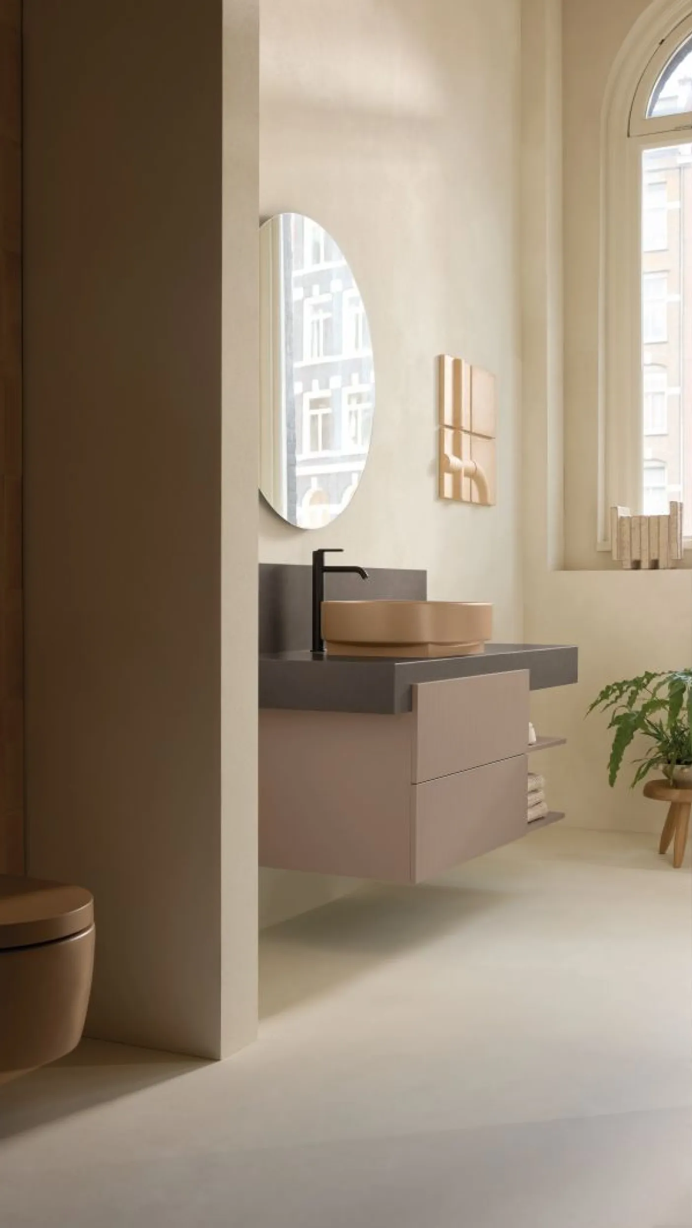 Die Aufsatzbecken werden zu ausdrucksstarken Blickfängen im Bad. Durch die Platzierung runder und ovaler Becken auf einem klaren Sockel erhalten sie eine fast architektonische Wirkung. Dieses Prinzip zieht sich konsequent durch die gesamte Kollektion. Von Waschbecken über WCs und Bidets bis hin zu Möbeln und Badewannen entsteht ein durchgängiges Gestaltungskonzept mit hohem Wiedererkennungswert.