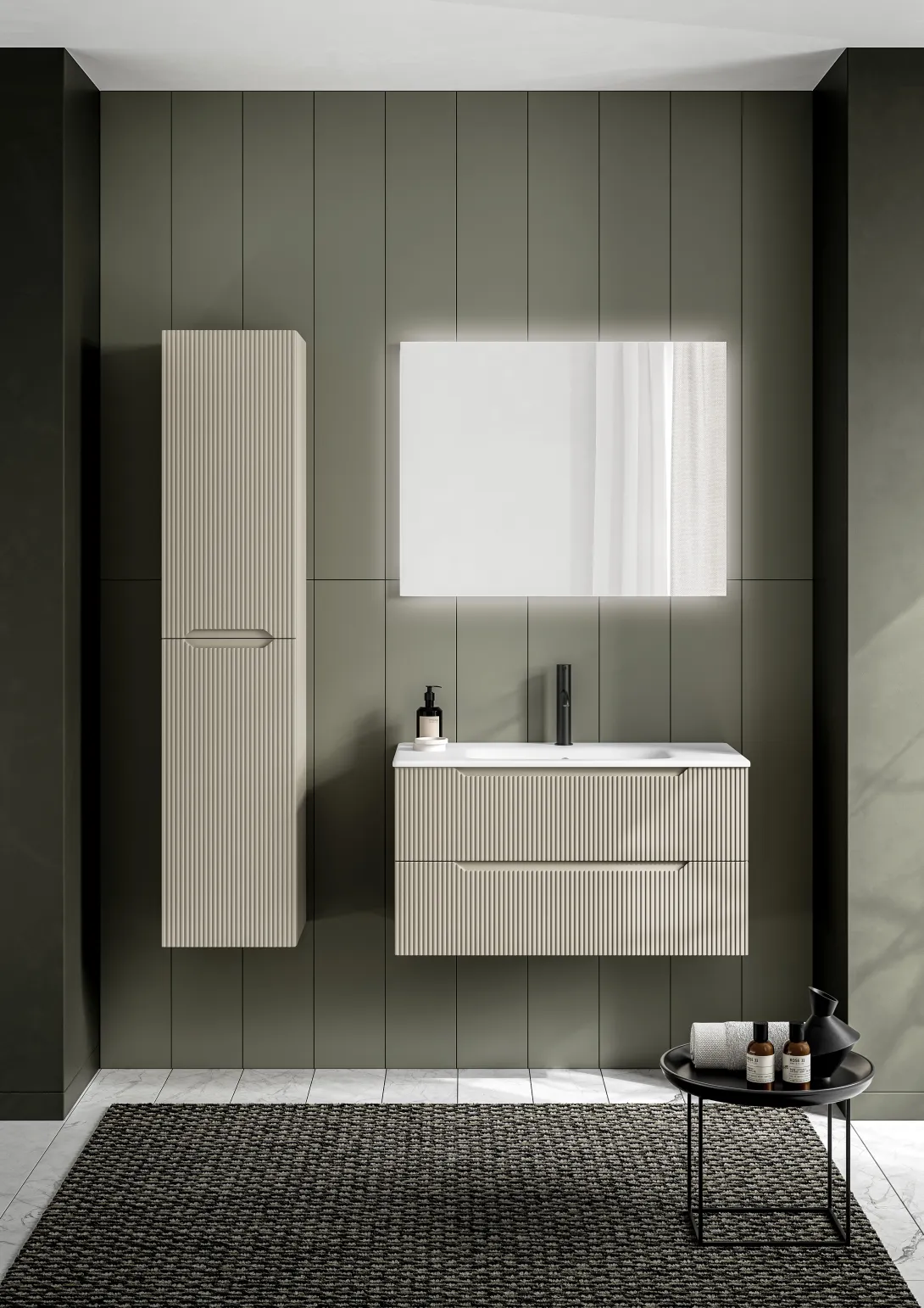 Die Badmöbelserie .Bravo verleiht dem Badezimmer mit seiner markanten geriffelten Frontstruktur und den grafisch integrierten Griffmulden einen einzigartigen Charakter. Eine Serie, die modernes Design mit hoher Alltagstauglichkeit verbindet.