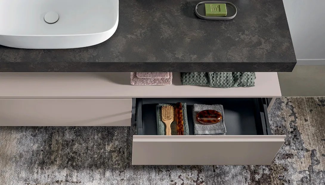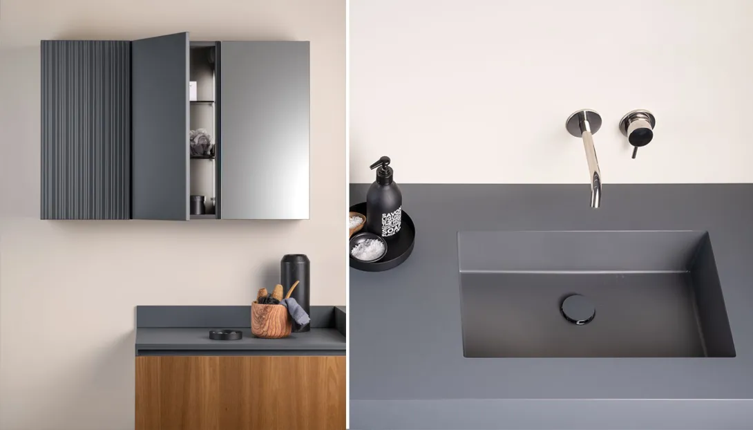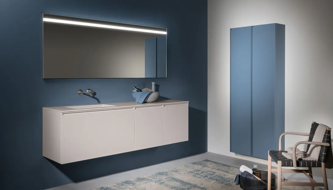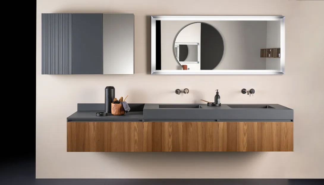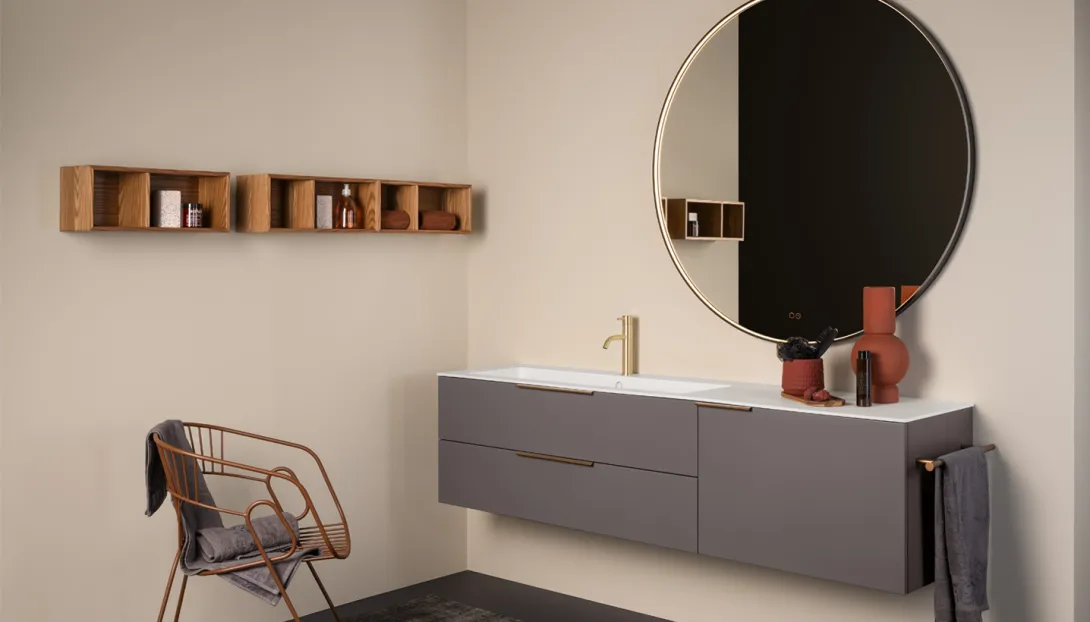 - Kombinierbar mit integrierten Becken, Aufsatzwaschbecken, offenen Elementen und Unterschränken